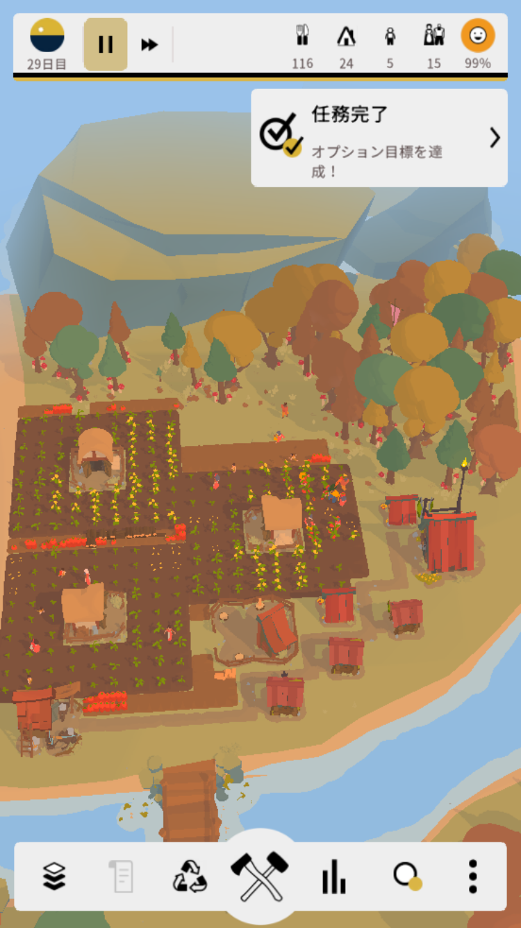 それでもまだまだ序盤ステージですので、採集小屋で食糧を確保しつつ建造物を建てる事で楽々クリアする事が出来ました!