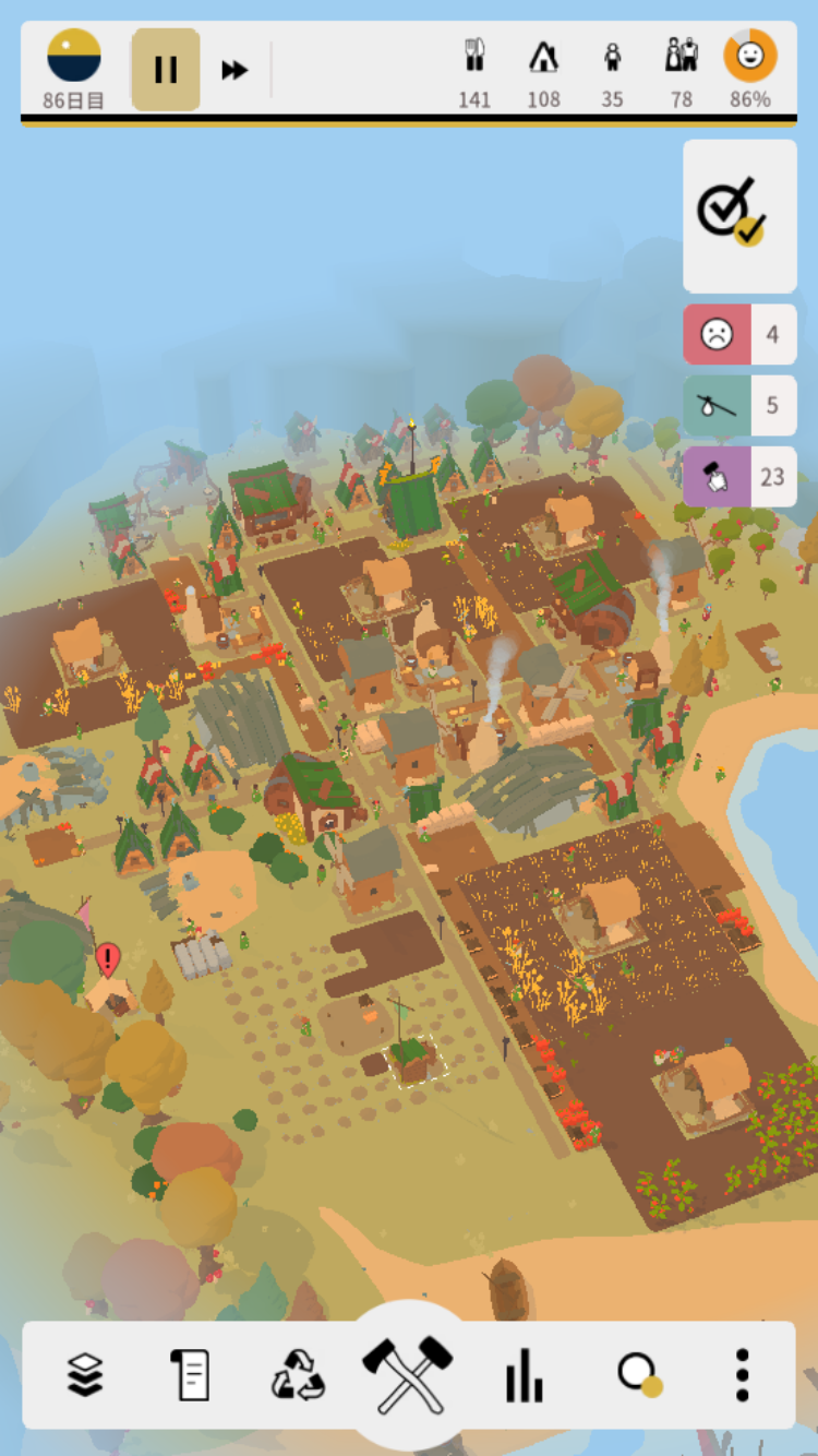 また、サブミッションクリアの為に人口を100人に増やす必要があるのですが、人口が増えるかどうかは運的要素があり、幸せレベルが高くても中々増えない事もあります。